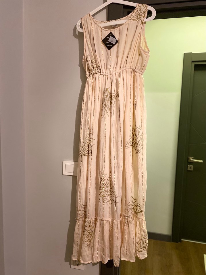 Nakışlı desenlere sahip bej uzun elbise, kolsuz günlük ve akşam kullanım için uygun. Sade ve şık incecik bir kumaşa sahip üretim yeri Hindistan hiç kullanılmadı etiketli standart beden