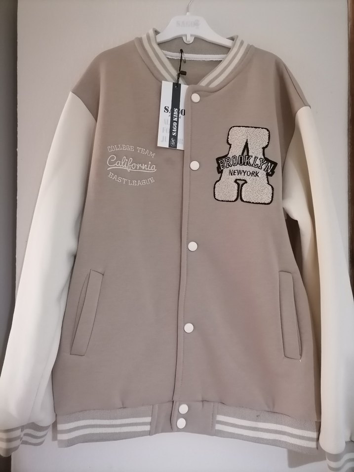 Bej renkli, çıtçıtlı, nakış detaylara sahip uzun kollu ve yuvarlak yakalı bol kesim unisex ceket. Yumuşak kumaştan üretilmiştir ve önünde "NEWYOR" yazısı bulunur.