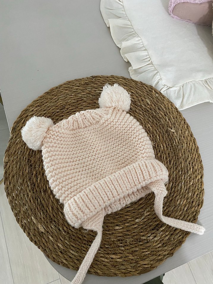 Bej renkli, nakış detaylı örgü çocuk bere. Bohem tarzda, yumuşak kulak ponponlu ve bağcıklı tasarım. 0-12