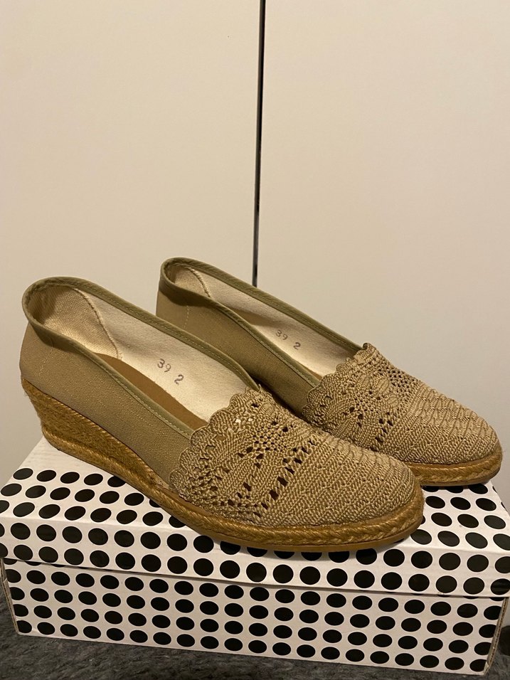 Bej renkte, dantel işlemeli ve nakış detaylı, kauçuk tabanlı dolgu topuklu kadın espadril. Günlük kullanıma uygun, klasik ve vintage tarzı yansıtır. TAKASA AÇIK ✅ Az kullanıldı temiz ve sorunsuzdur, sorularınızı sorabilirsiniz. 24 saat içerisinde kargoya verilecektir.
