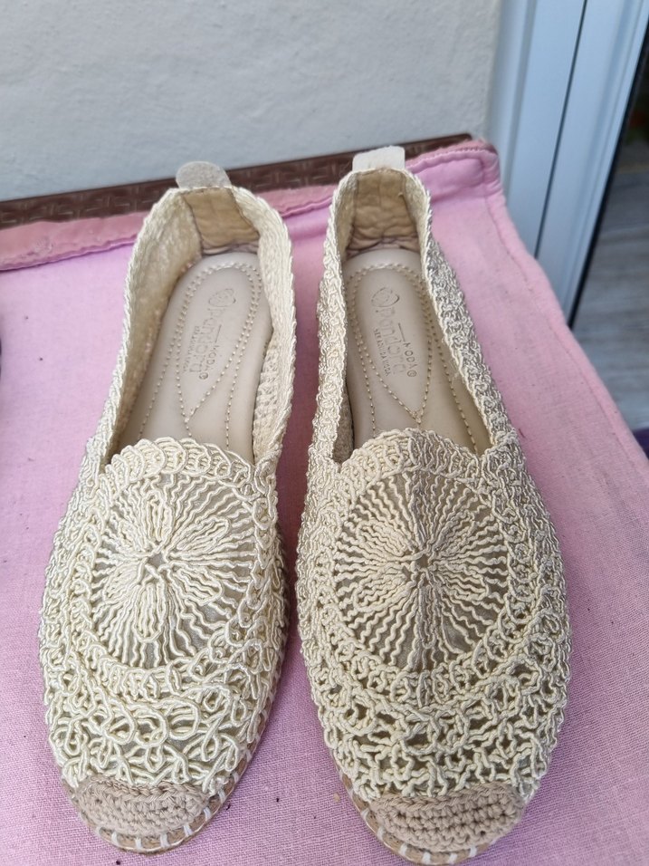 Yumuşak triko dokusundan, bej renkli, nakışlı dantel detaylı, kama topuklu kadın espadril. Bohem düğünler için uygun.