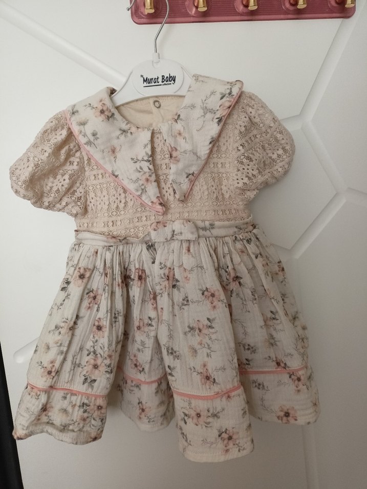 Bej renkli, kısa kollu, bol kesim kız elbisesi. Nakışlı dantel detayları ve bohem tarzda pastel çiçekli yakası bulunur. 6 ay