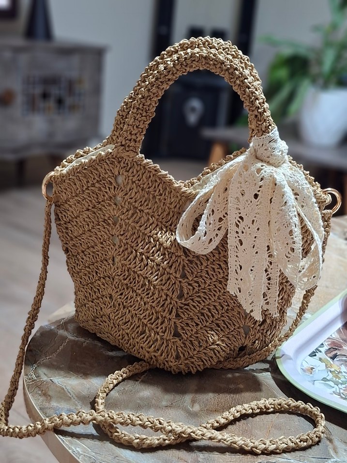 Nakışlı desen ve dantel detayına sahip bej örgü kadın çanta, kısa sap ve uzun askıyla kullanım seçenekleri sunar. Günlük kullanım için uygun bohem tarzda.