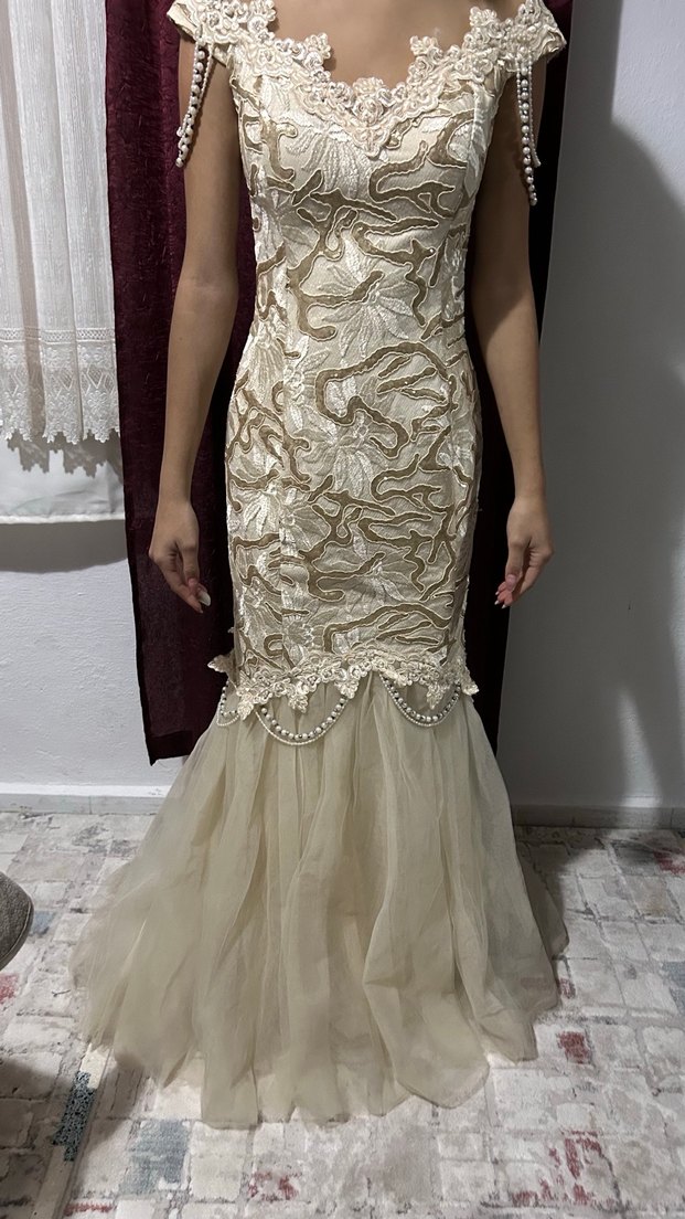 Bu bej renkli, nakışlı ve dantelli uzun straplez gelinlik bohem tarzda ve kolsuzdur. Dantelin ve tülün muhteşem uyumu bu gelinlikte birleşmiştir.Gelinliğin kolları ve aşağı dantelin bittiği yerler inci ve boncuk işlemelidir. Balık model dantelin bittiği yerde devreye tüller süslüyor. Boy:1.52 cm