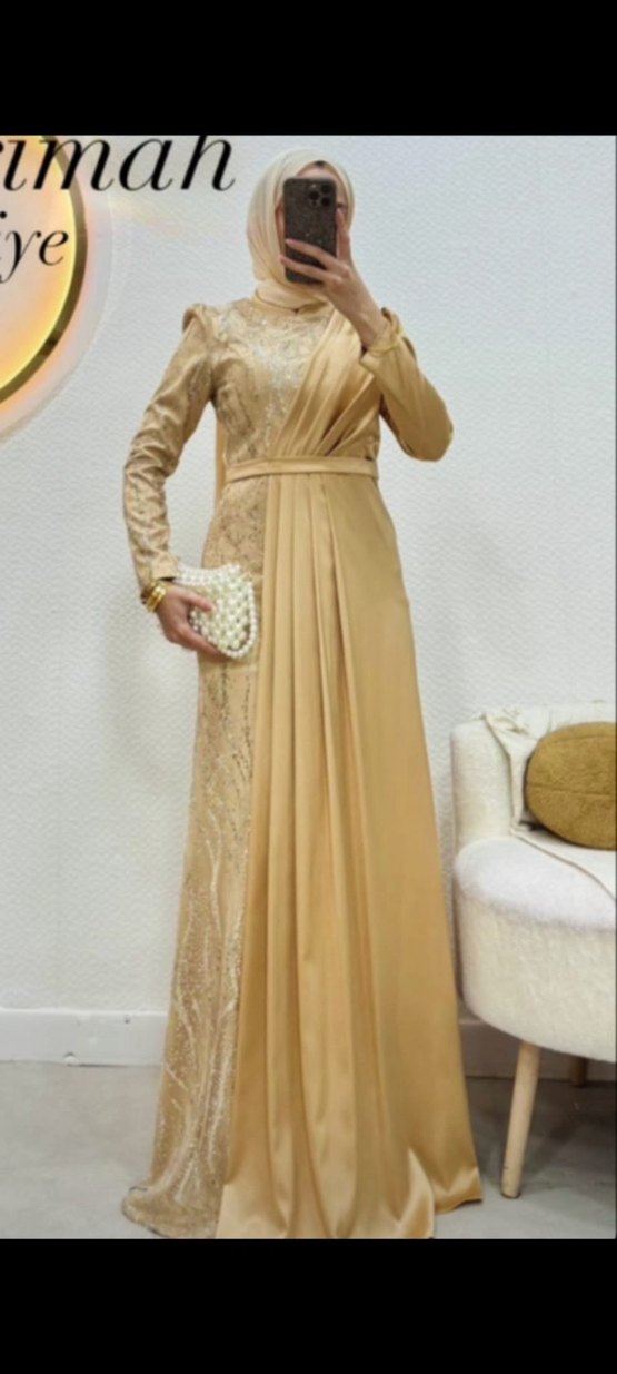 Bej renkli, nakışlı ve drapeli detaylara sahip uzun abiye elbise, uzun kollu ve straplez yakalıdır. Düğünler için modern klasik tarz sunar. Hiç giyilmedi düğün iptal olduğu için satıyorum pazarlık payı yok çünkü bu fiyatta aldım