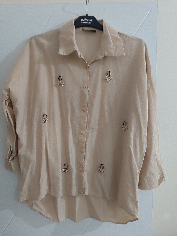 Bej keten gömlek, düğmeli ve nakış detaylıdır. Geniş kesim, yakalı ve uzun kolludur, günlük kullanıma uygundur. ✨