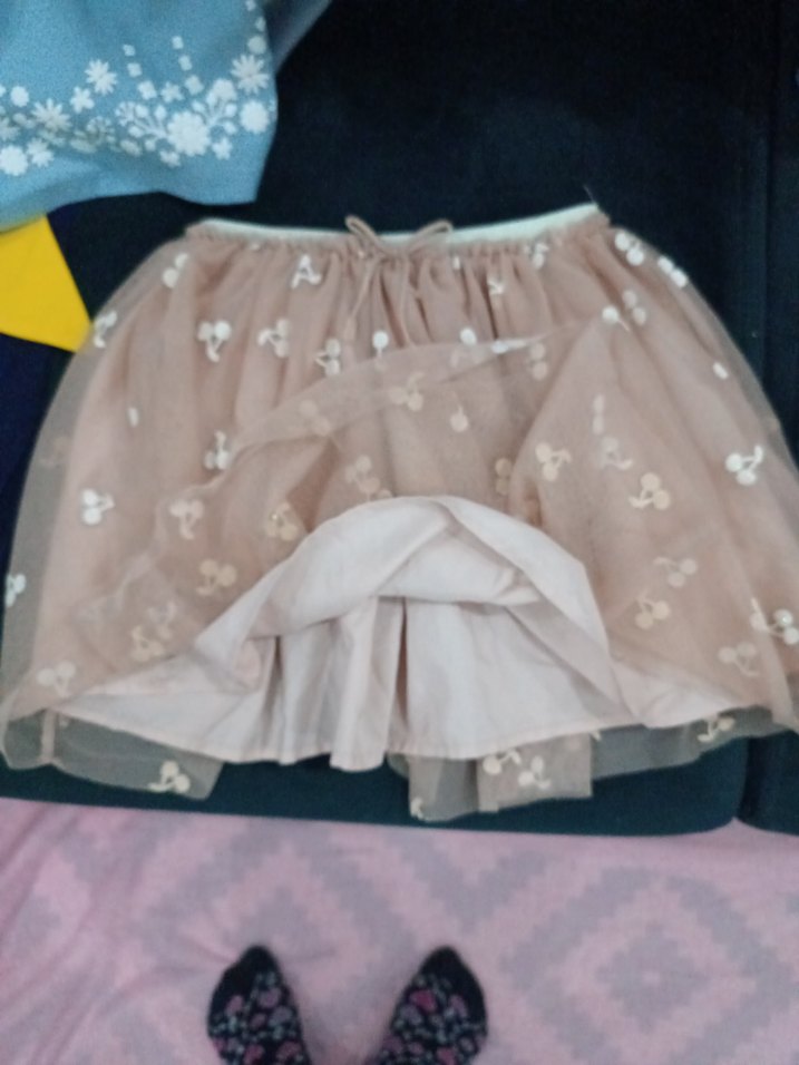 Hafif sentetik kumaştan, nakışlı desenli ve fırfırlı bej kız eteği. Salaş kesimiyle sokak modasına uygun şık bir seçenek.