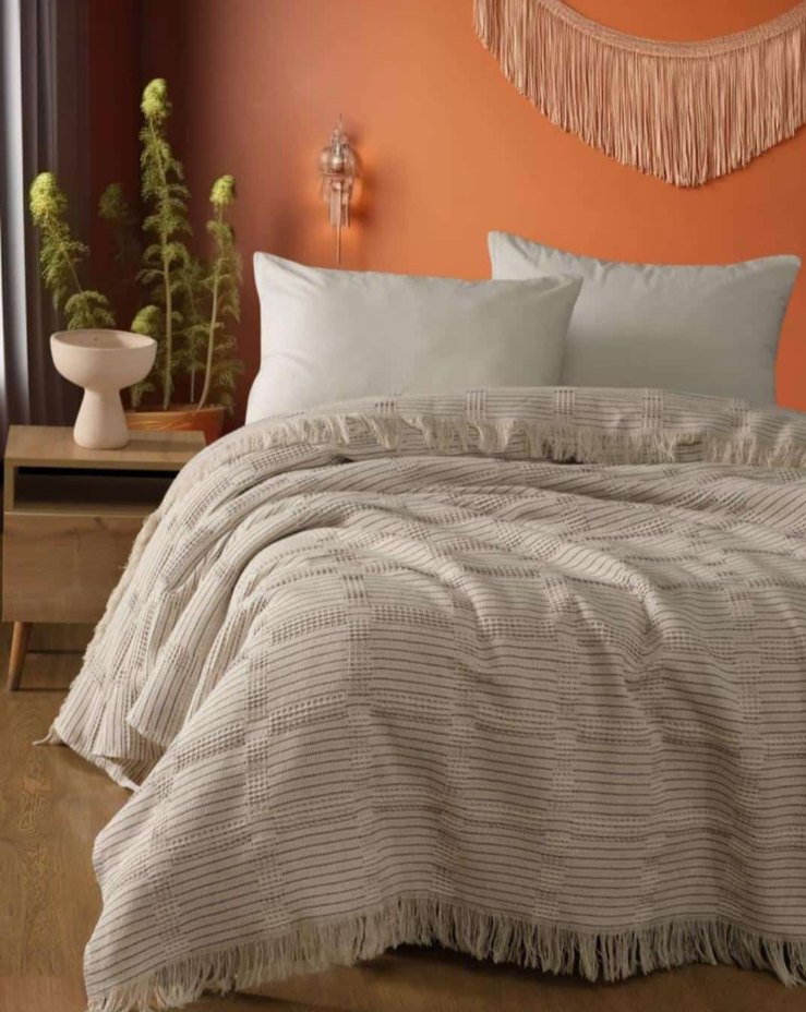 Bej renkli yatak örtüsü, gri nakış desenleri ve püsküllü kenarlarıyla yatak odanıza doku ve zarif bir detay katar. ️