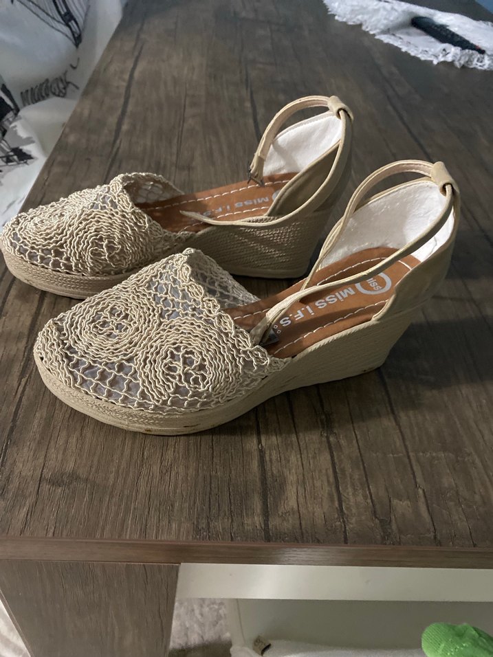 Nakışlı ve dantelli bej dolgu topuk kadın sandalet, bohem tarzına uygun. Günlük kullanıma rahat bir seçenek.