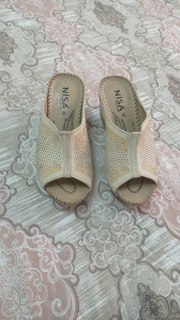 Bej renkli, dolgulu topuklu kadın terlikler, kauçuk tabanlı, dantel detaylı ve nakışlı desenlere sahip. Günlük kullanıma uygun. Marka: NiSA.