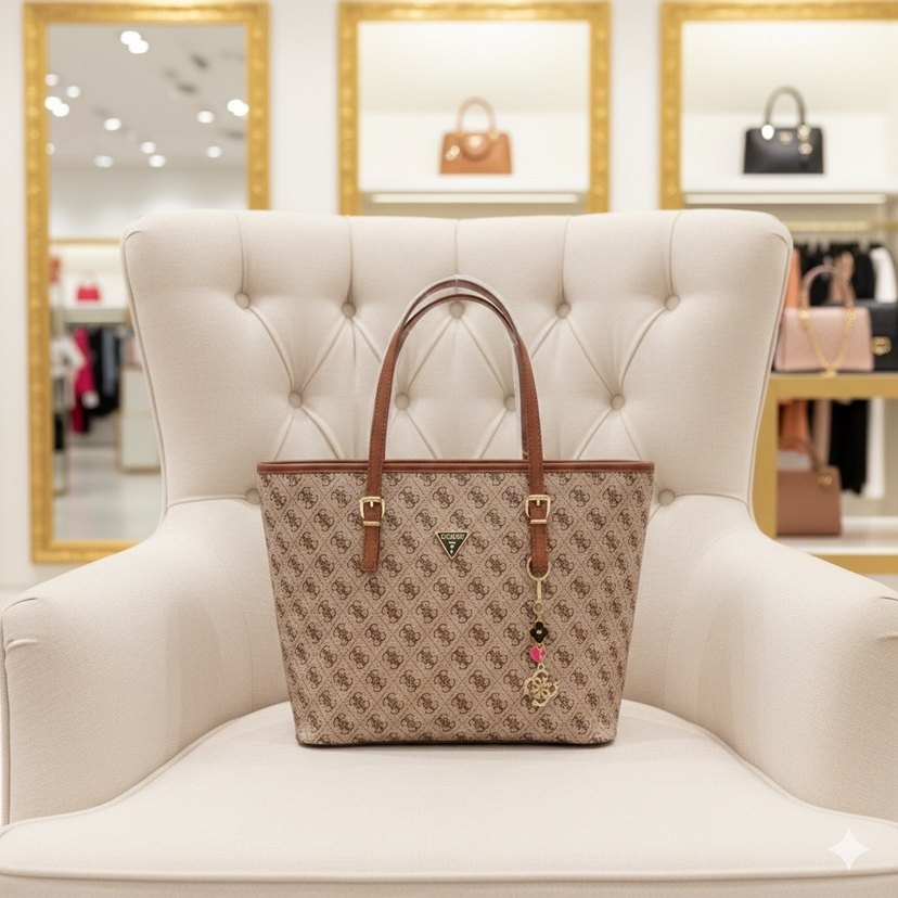 Bej renkli, nakışlı desene sahip, kemerli tasarımlı kadın el çantası. Sentetik kumaştan yapılmış, Paris tarzında modern klasik şıklık sunar. En 34 boy 28 cm