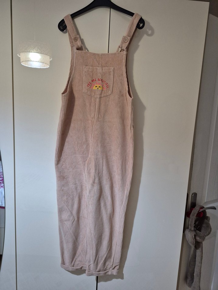 Bej keten, bol kesim ve kolsuz uzun tulum, nakış detaylı ve düğmeli askılıdır. Günlük rahat sokak stili için uygundur.