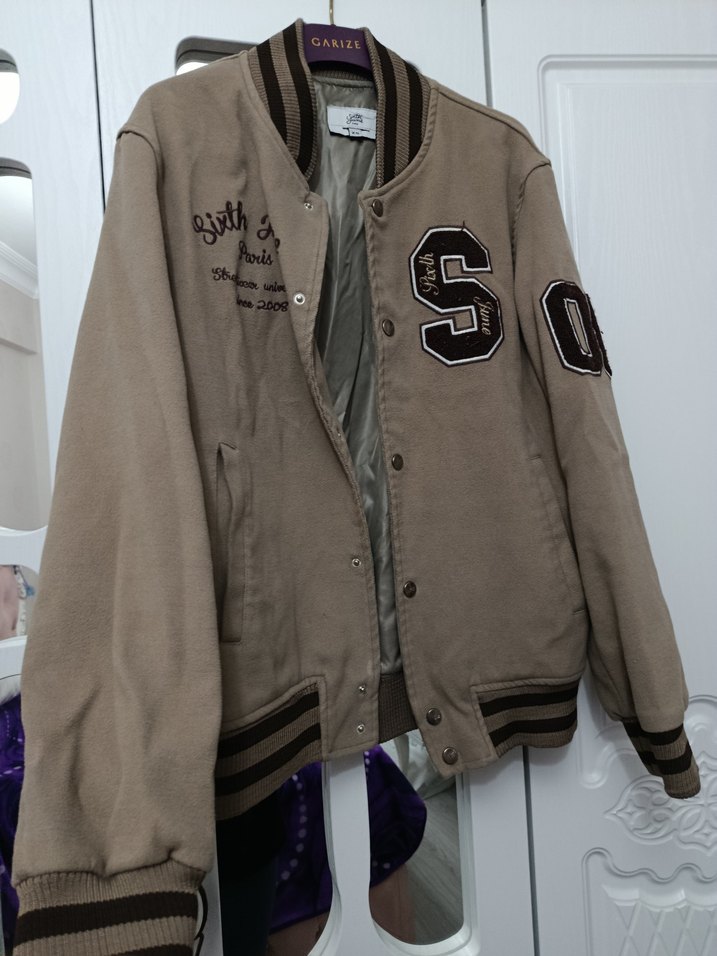 Bej renkte, nakış detaylı süet kumaştan, düğmeli ve uzun kollu, salaş kesim kadın ceket.