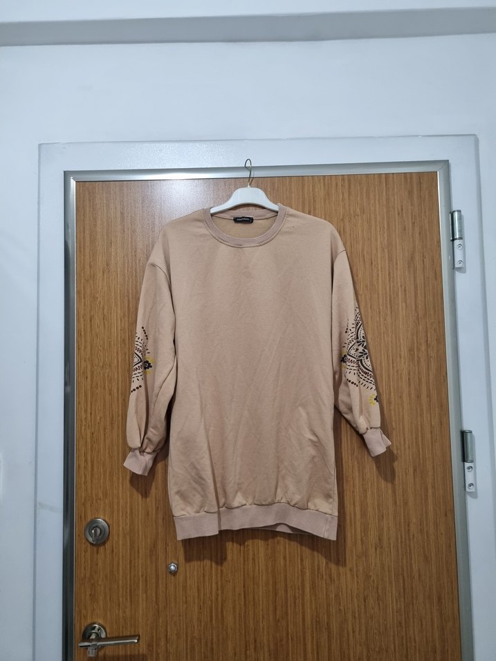 Nakış detaylı bej uzun kollu sweatshirt, bol kesim ve bisiklet yaka. Sentetik kumaştan, rahat ve şık günlük kullanım için uygun.
