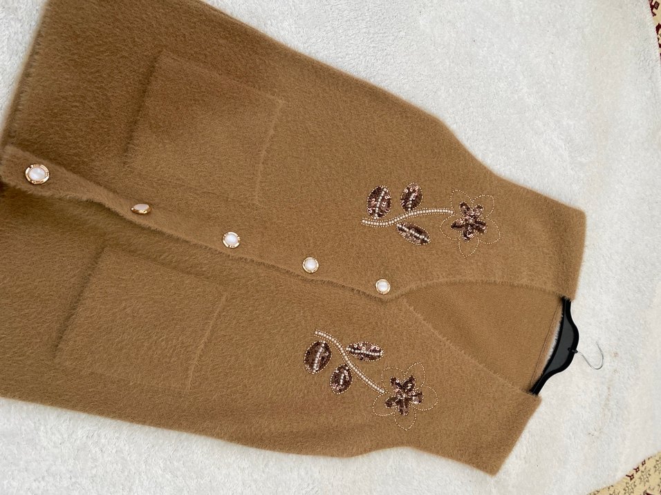 Bej renkli uzun triko kaban, nakışlı çiçek desenleri ve kürk detaylarına sahiptir. Çentikli yaka, uzun kollu ve rahat kesimle bohem tarzda, şık ve sıcak bir görünüm sunar.