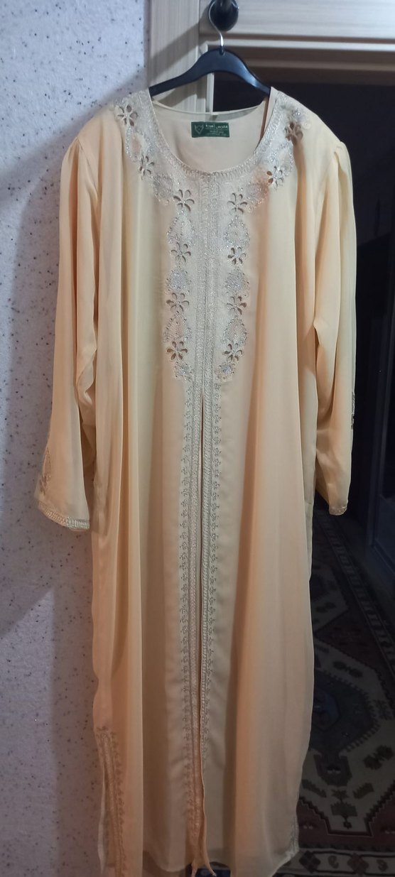 Bej renkte uzun, nakış detaylı, drapeli ve bol kesim ipeksi kumaştan kadın elbisesi. Uzun kollu ve V yakalı, düğün için uygun.