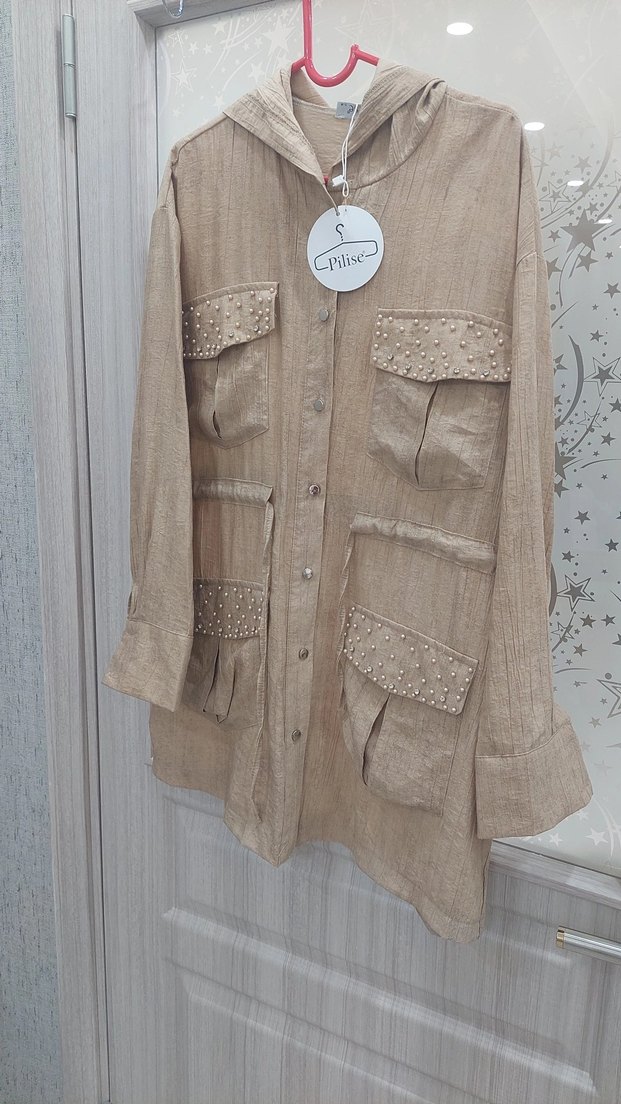 Bej keten kumaştan, uzun kollu, düğmeli, yakalı ve nakışlı detaylara sahip bol kesim kadın gömleği. Günlük kullanıma uygun bohem tarz.40.42 .44 beden uyumdur