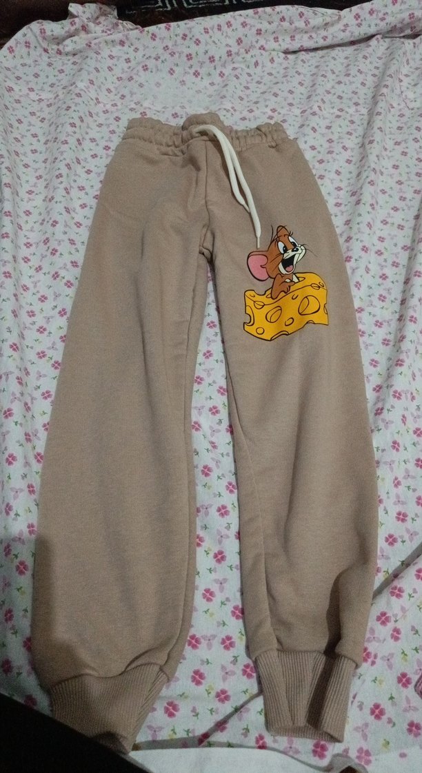 Nakışlı çizgi film figürlü, bej renkli, bol kesim kız çocuk eşofmanı. Yumuşak kumaş, düğmeli bel ve lastikli paça detaylıdır. Rahat sokak stili için uygundur.