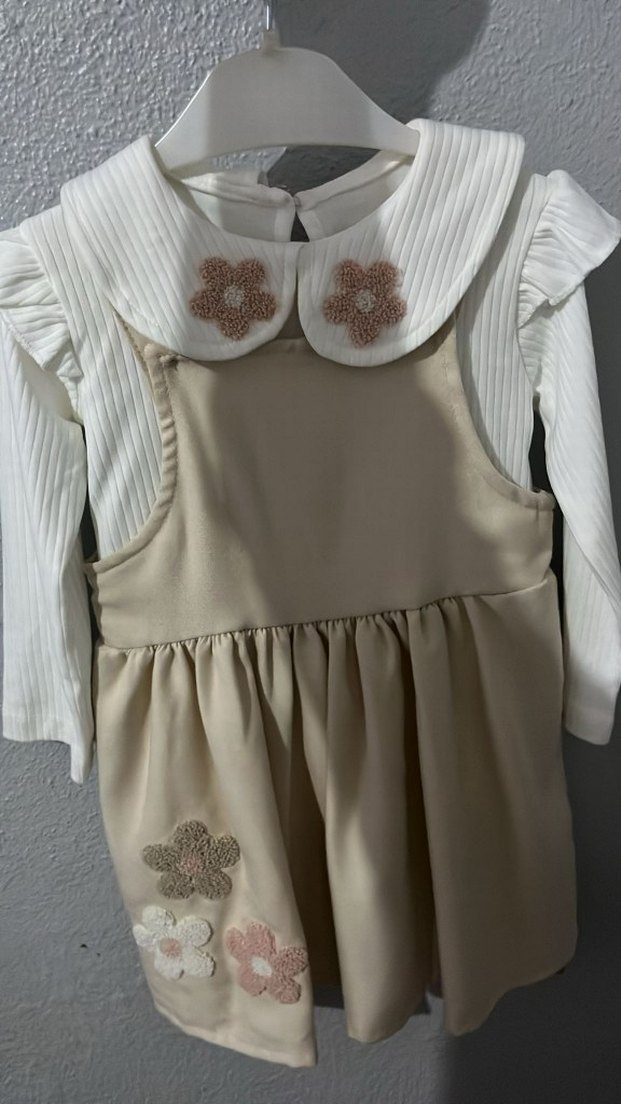 Bej renkli kız elbisesi, yakalı ve askılı kol detaylıdır. Nakışlı çiçek desenleri ve fırfırlarla süslenmiştir. Rahat kesimli ve bohem tarzda, pastel tonlardadır.
