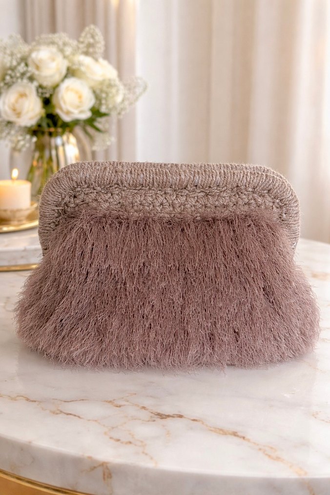 Nakışlı desenlere ve kürk detaylara sahip bej triko clutch çanta, bohem tarzda, pastel ve rahat bir görünüm sunar. Zarafetin en yumuşak hali ✨ Dokusu dokunma isteği uyandıran, sade ama etkisi güçlü bir parça.