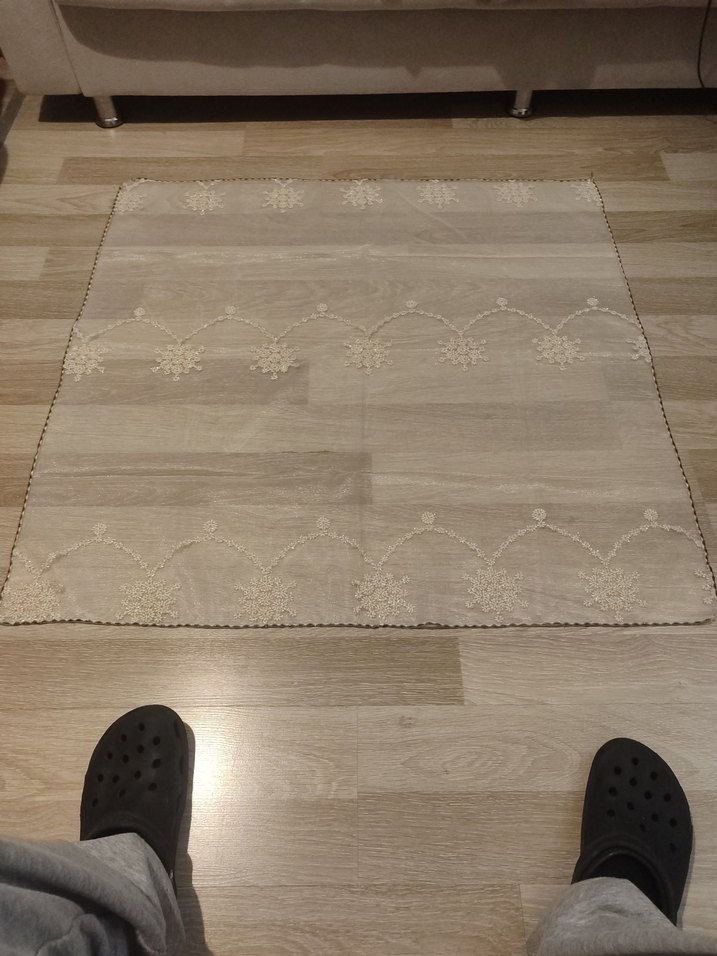Bej renkte, geleneksel tarzda ince nakış desenlerine sahip masa örtüsü, hafif gri tonlar içerir. Masanıza zarif bir dokunuş katar.