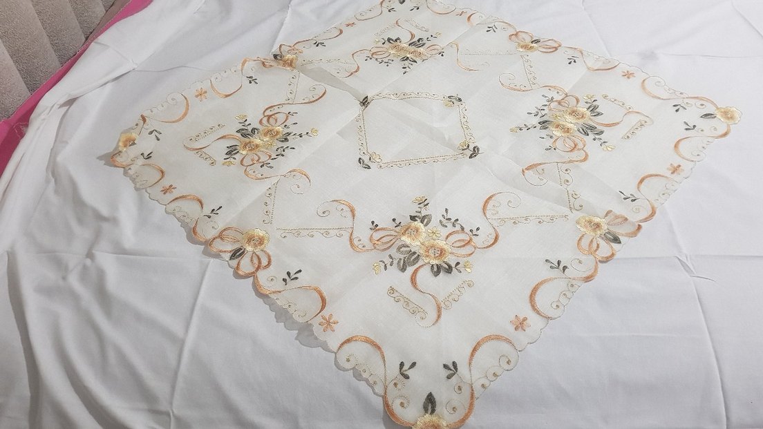 Bej renkte, nakışlı çiçek desenleri ve klasik tarzda, dalgalı kenarları olan masa örtüsü. Masanıza zarif bir dokunuş katar.