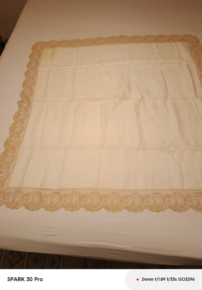 Bej renkte, nakışlı kenar detaylarına sahip geleneksel tarzda masa örtüsü. Hafif renkte kumaştan üretilmiştir. 130 a 130