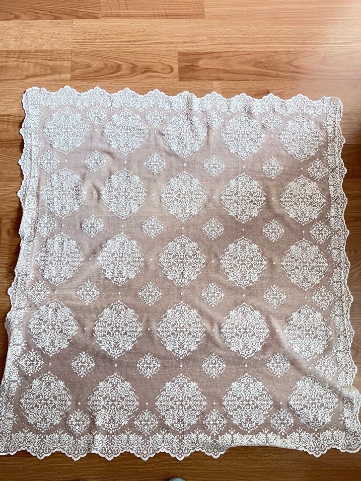 Açık bej renkte, nakışlı desenlere ve dalgalı kenarlara sahip geleneksel tarzda masa örtüsü.