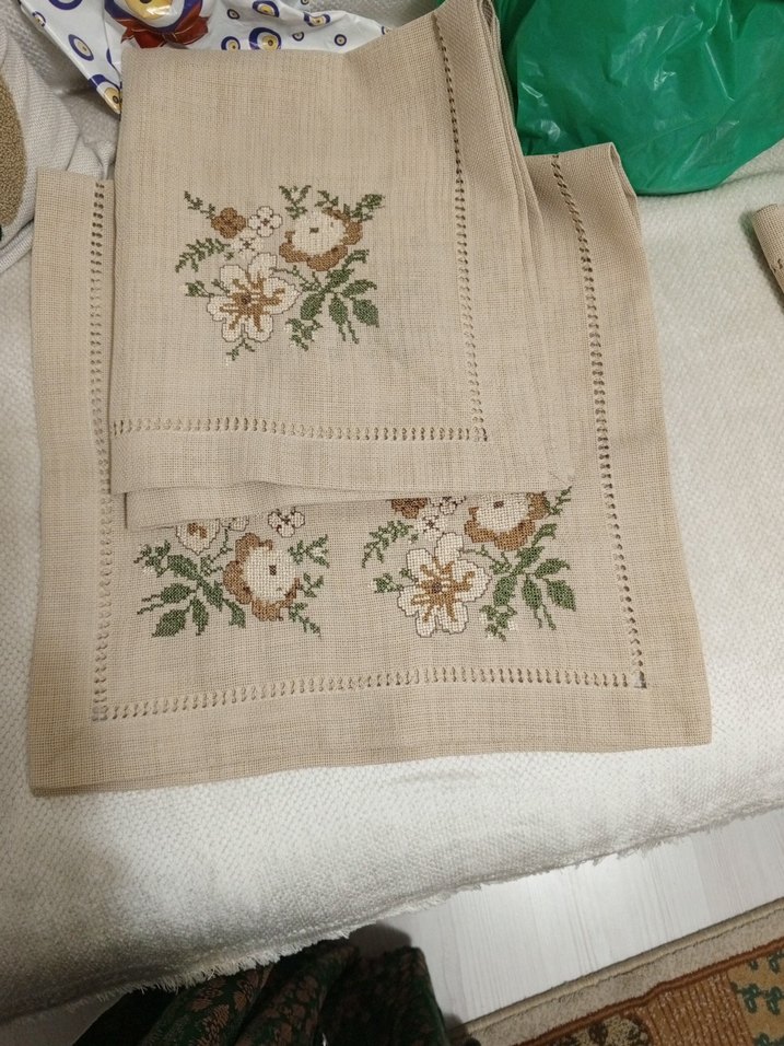 Bej renkte, yeşil ve kahverengi tonlarda çiçek nakışlı, klasik görünümlü masa örtüsü seti. kanaviçe üçlü set