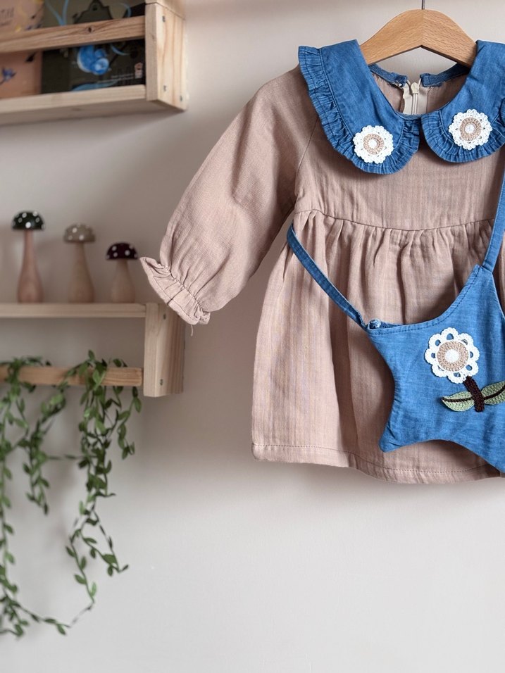Ürün bedenleri: 1 yaş, 2 yaş, 3 yaş, 4 yaş Bej renkli müslin kumaştan, uzun kollu, düğmeli ve nakış detaylı yakalı bol kesim kız elbisesi. Bohem tarzda, pastel tonlarda.