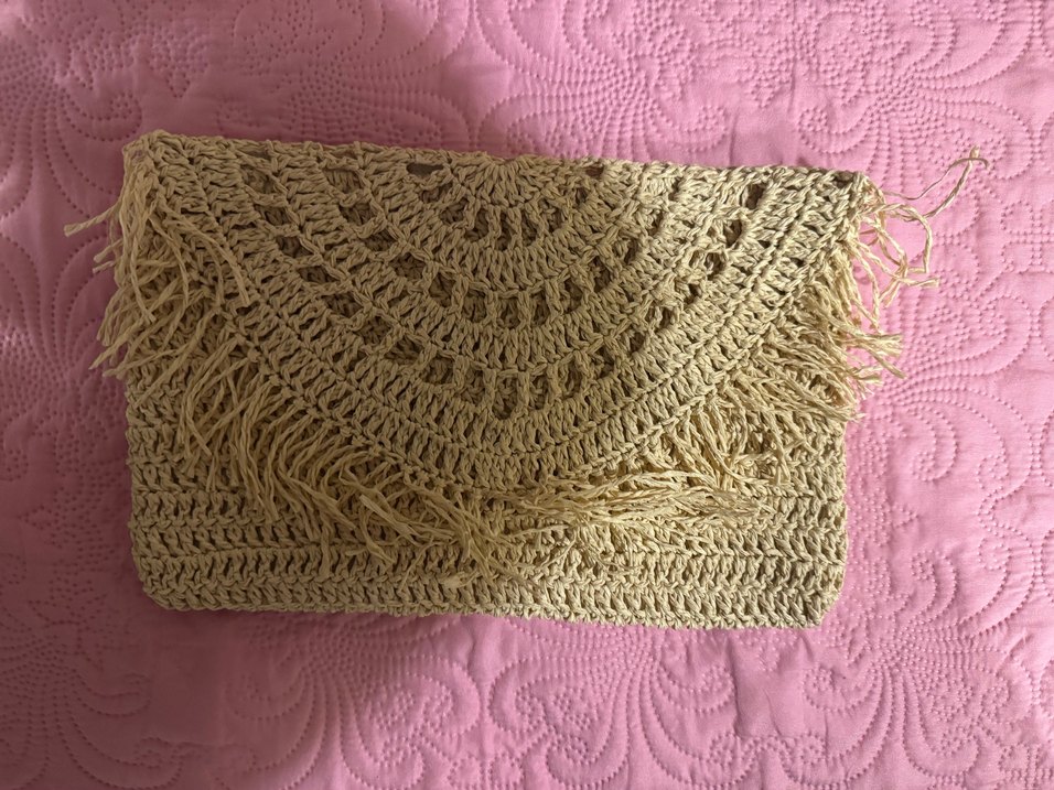 Hafif bej renkte, nakışlı dantel detaylı örgü bohem kadın portföy çanta. Günlük kullanım için uygundur.