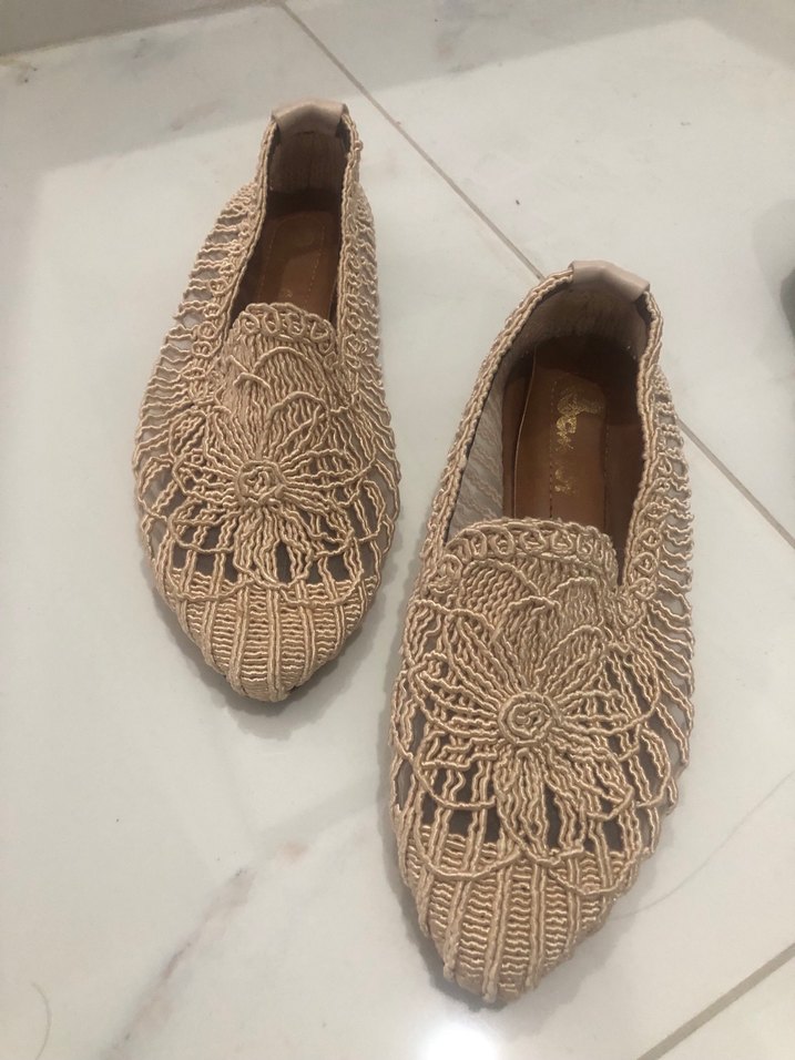 Bej renkli, nakışlı dantel detaylı örgü kadın babet ayakkabı, bohem tarzıyla günlük kullanıma uygundur.