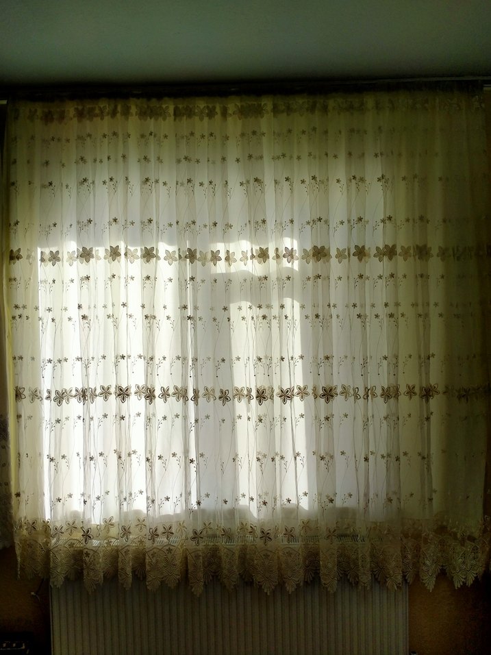 Hafif bej renkli, nakışlı desenlere sahip klasik tarzda perde, yumuşak ve zarif bir görünüm sunar. yırtığı söküğü yoktur normal pencerelere uygun güzel desenli perde.