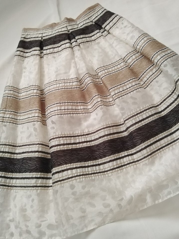 Bej renkte, nakışlı ve pilili uzun kadın eteği. Yumuşak sentetik kumaştan üretilmiş, bol kesim ve gri-bej çizgili detaylara sahip. Ofis için uygun, bohem tarzda. 36 38 beden uyumlu