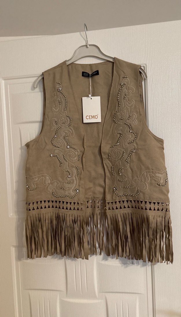 Bej Nakışlı Püsküllü Süet Yelek