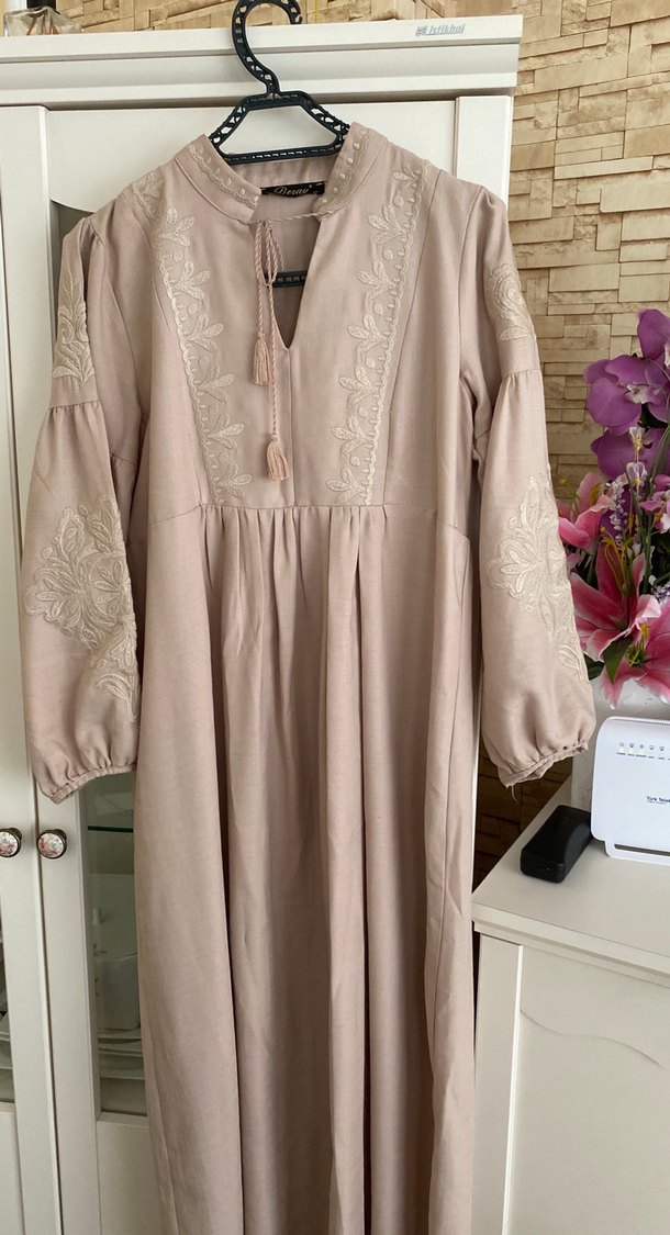 Bej Nakışlı Püsküllü Uzun Keten Elbise