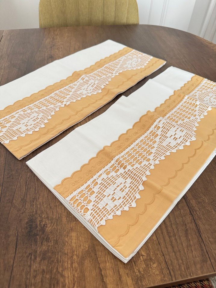Bej renkte, beyaz nakışlı dantel detaylı yastık kılıfı takımı, zarif ve şık bir görünüm sunar. 2 adet yastık kılıfı 69cm yastık kapamı cebi mevcut Hiç kullanılmadı