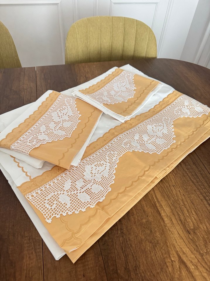 Bej renkli, zarif nakış detaylarına sahip nevresim ve çarşaf seti, yatak odanıza şıklık katıyor. Yastık 2 adet 69cm yastık başı kapama cepli Çarşaf 1 adet 110*220 cm tüm kenarları piko Nevresim 1 adet 220*200cm fermuarlı Çeyizim için yaptırmıştık sadece 1 kez bebek Kuran’ında sermiştim. Güzel günlerde kullanılsın.