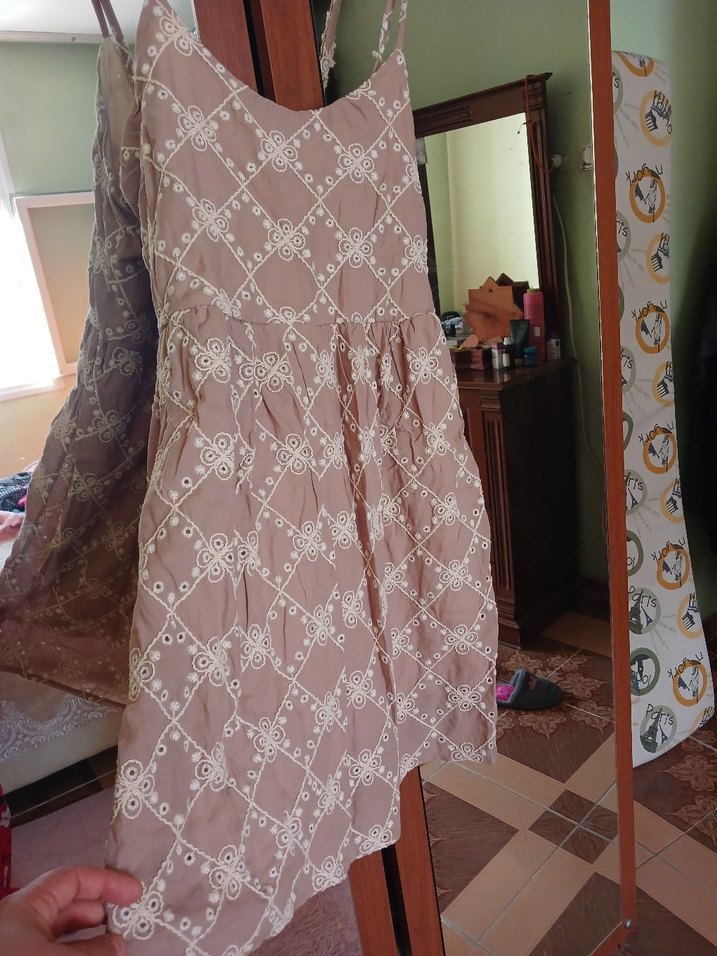 Nakışlı dantel detaylı, straplez yaka ve bol kesimli bej midi elbise. Bohem tarzıyla günlük kullanıma uygundur.
