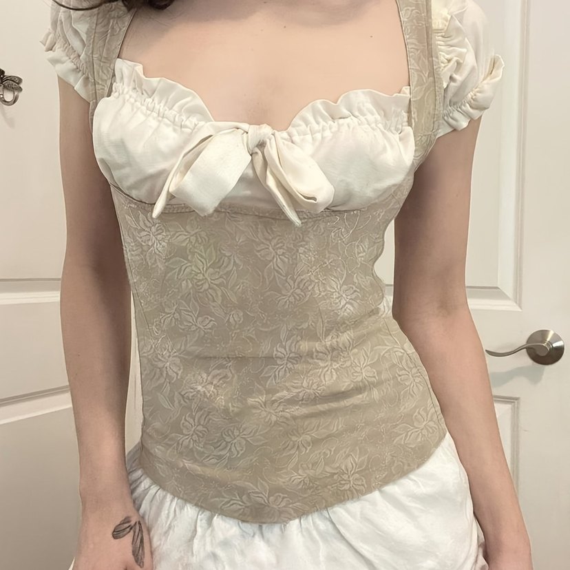 Bej renkli, nakışlı çiçek desenli ve dantel detaylı keten bustiyer. Vücuda oturan kesimi ve midi boyu ile klasik ve bohem tarzı yansıtıyor.