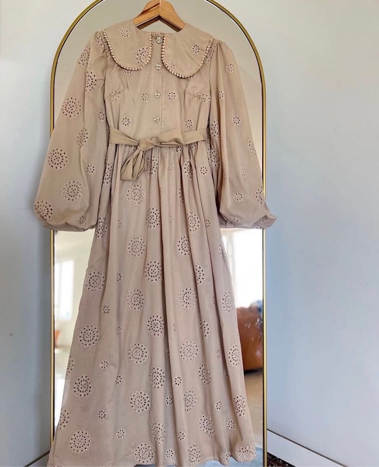 Bej renkte, nakış ve dantel detaylı uzun pamuklu elbise. Yaka ve kemerli, salaş kesimli, askılı kollu. Hiç kullanılmadı, sadece etiketi yok. Fistolu elbise. Çok tatlı duruşu var. Çok fazla elbisem olduğu için satışa koyuyorum. Astarlıdır