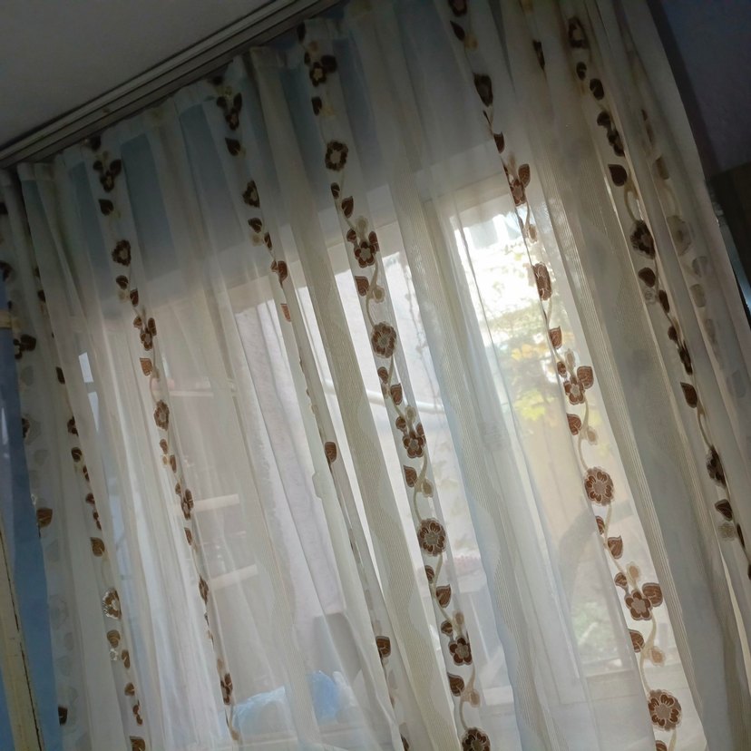 Hafif bej renkte, nakışlı çiçek desenli tül perdeler. Geleneksel ve şık bir pencere görünümü sağlar. kusuru etek ucları cekılıcek ip, çekilmesı var üç kısımlarda yukarı doğru hiçbirsey delık defo yok saglam