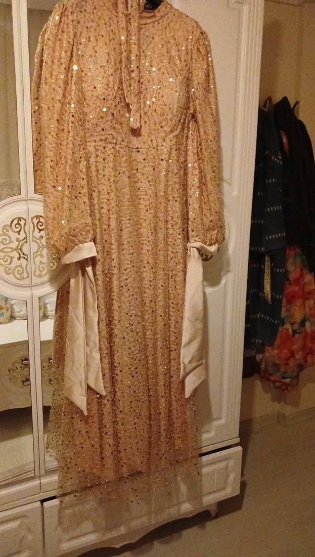 Bej renkli, nakışlı desenlere sahip, uzun ve bol kesim bohem elbise. Uzun kollu ve V yaka model, düğünler için uygun.