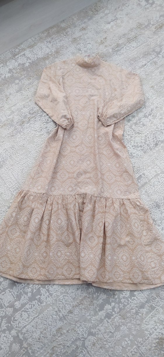 Bej renkli uzun elbise, nakışlı dantel desenli detaylara ve rahat kesime sahiptir. Uzun kollu, keten kumaştan yapılmış bohem tarzda bir modeldir.sayılı giyilmiştir yeni gibidir. hiçbir deformesi yoktur. rahat kkesim olduğu için 44 bed ne kadar olur. marka temsilidir.
