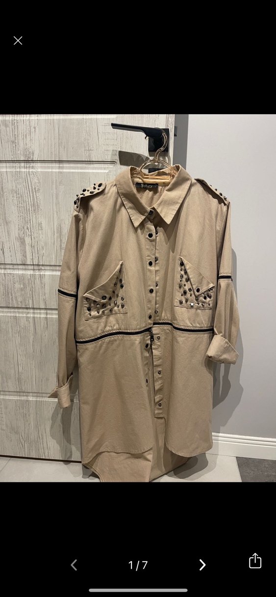 Bej renkli, nakış detaylı, uzun ve bol kesim kadın gömleği. Düğmeli önü, uzun kolları ve notched lapel yakası ile günlük kullanıma uygun.