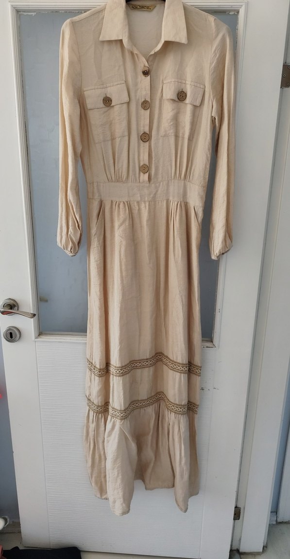 Bej renkli uzun keten elbise, düğmeli, uzun kollu, notalı yakalı ve nakışlı detaylara sahip, bol kesim bohem tarzda.