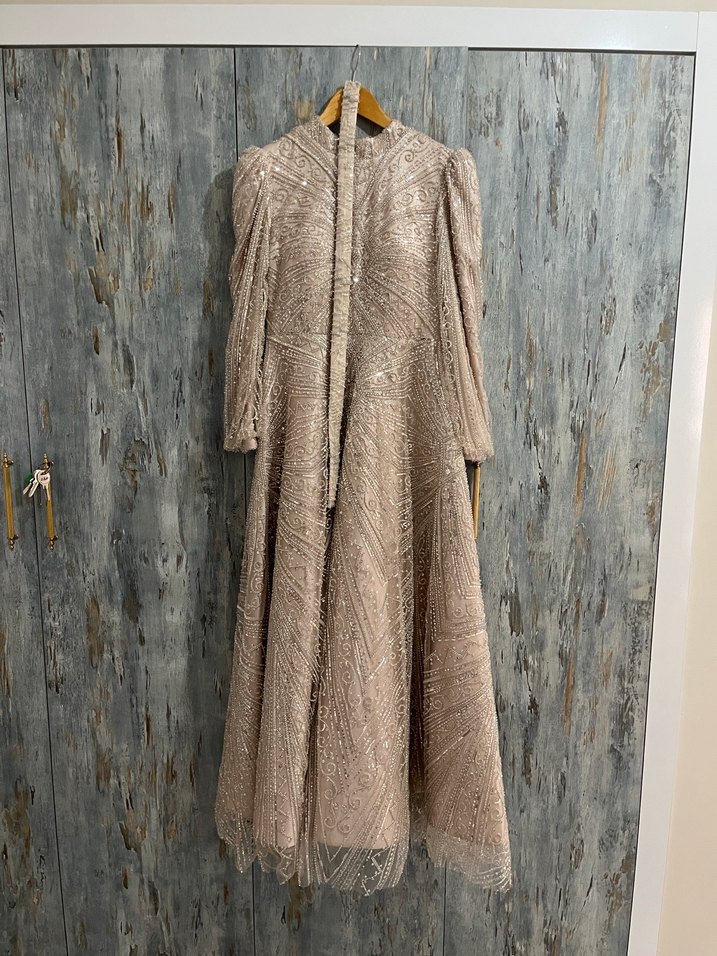 Bej Nakışlı Uzun Kollu Abiye
