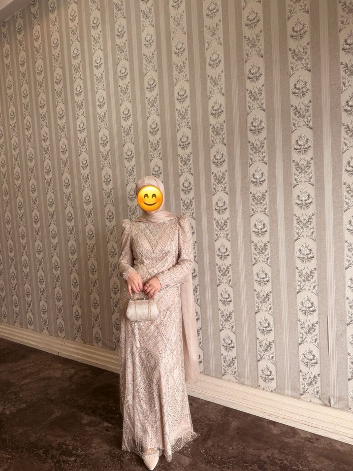 Bej Nakışlı Uzun Kollu Abiye Elbise