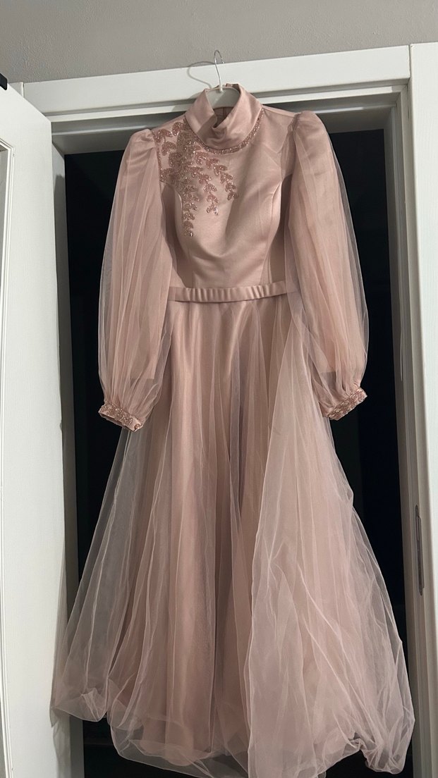 Bej pastel renkte, yüksek yakalı, drapeli ve nakışlı detaylara sahip, uzun kollu ve vücuda oturan uzun abiye elbisedir.