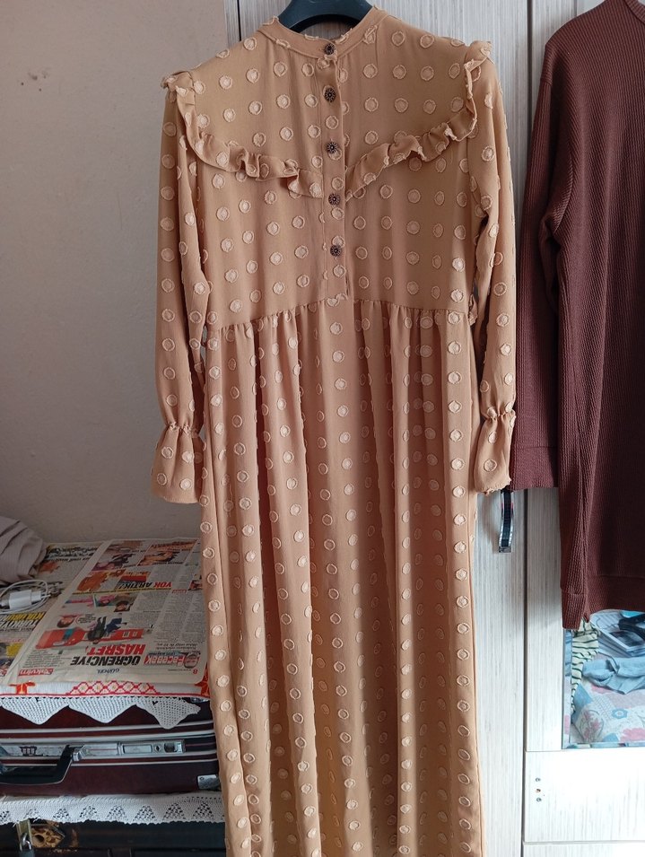 Bej renkte, nakış işlemeli ve fırfır detaylı uzun kollu bol kesim elbise. Yumuşak sentetik kumaştan, bohem vintage tarzı için uygun.